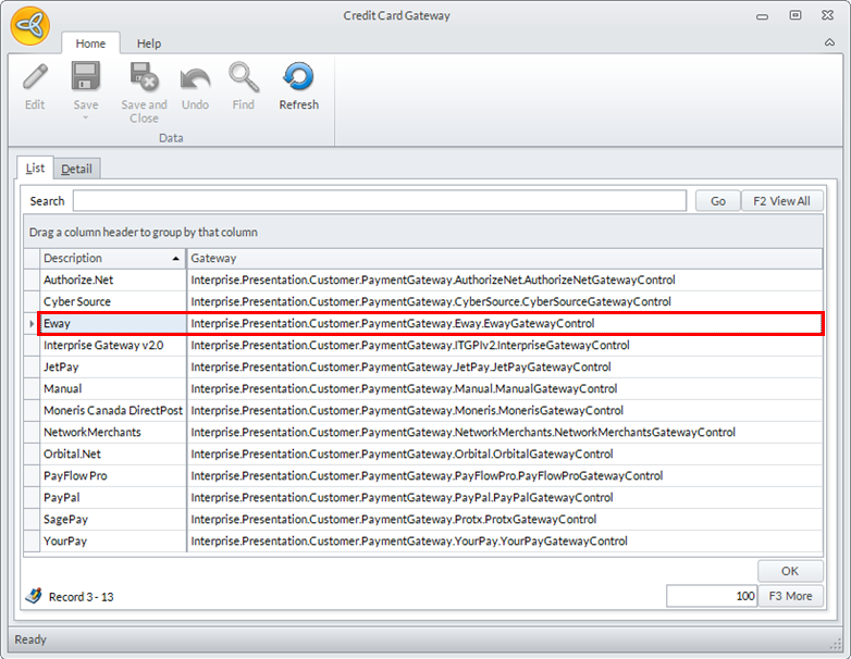 - Go to Banking > Setup and select the Credit Card Gatewayoption. The list of supported credit card gateway will be displayed.