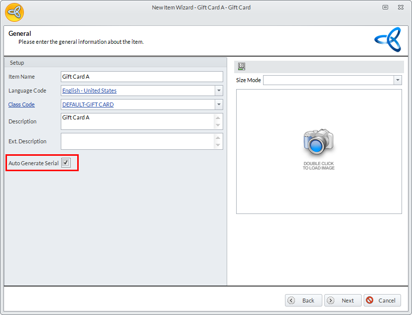 To automatically generate the gift card/certificate serial numbers, tick the Auto Generate Serial checkbox from the General page of the New Item Wizard or from the Setup tab of the Item Detail form. If you want to manually enter the serial number, untick the Auto Generate Serial checkbox.