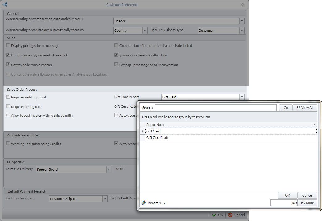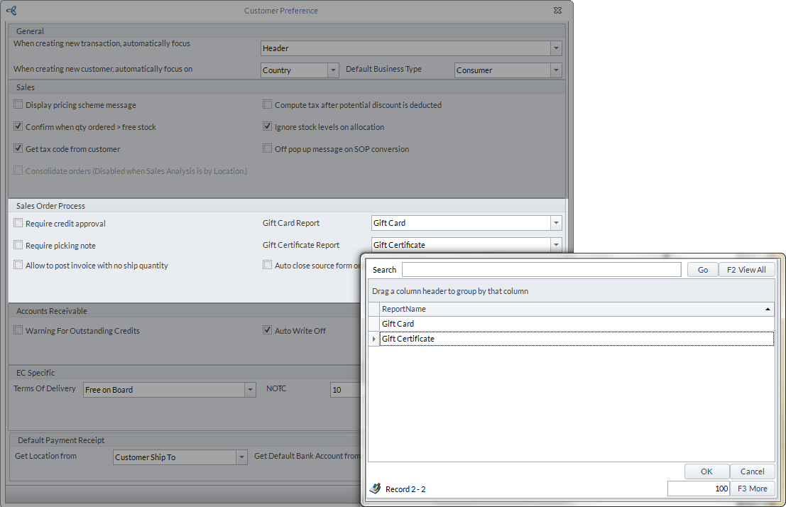 If you want to set a default report for sending gift cards/certificates via email, you can set it from Customer module > Setup> Preference > Preferences. In the Sales Order Process section of the Customer Preference form, select the default report for the gift card/certificate from the Gift Card Report dropdown list.