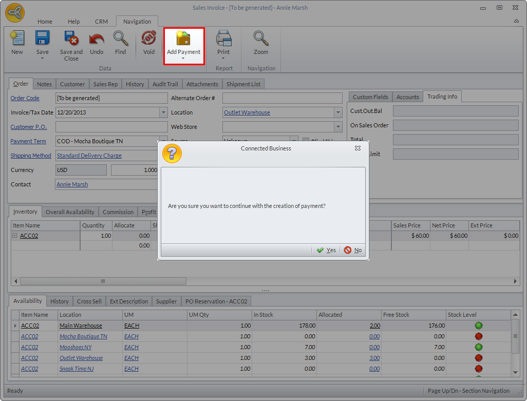 - Click the Add Payment button. A message prompt will be displayed confirming the creation of payment. Click Yes to proceed. The Payment form will be displayed.