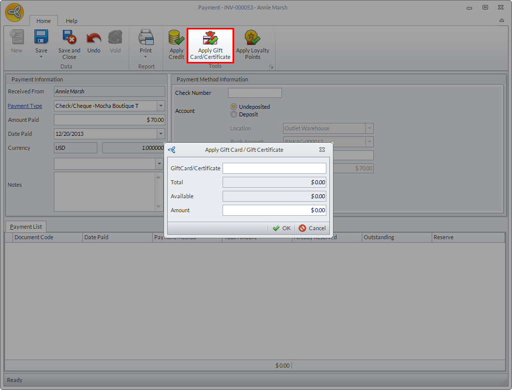 - In the Payment form, click the Apply Gift Card/Certificate button. The Apply Gift Card/Certificate dialog box will be displayed.