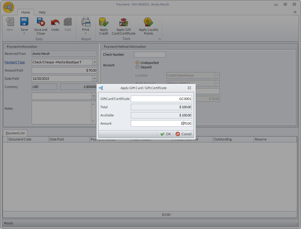 - Modify the total amount to be deducted from the gift card/certificate as needed then click OK.