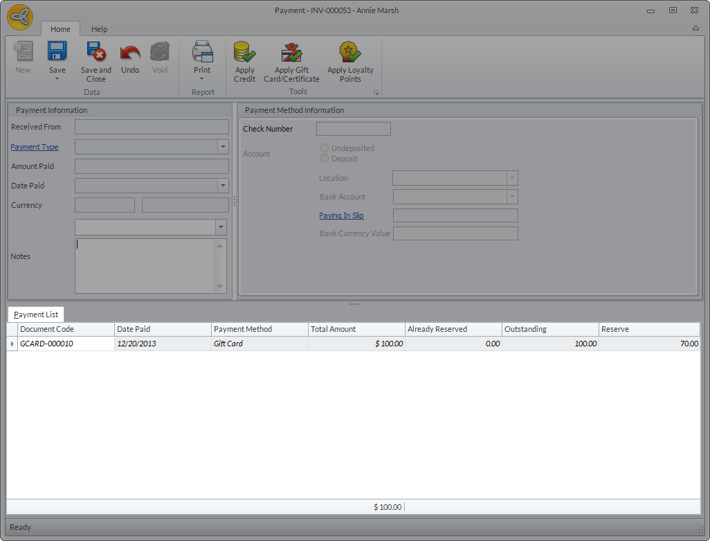 - In the Payment List section of the Payment form, the details of the payment transaction will be displayed. The total amount to be applied to the invoice is indicated in the Reserve column.