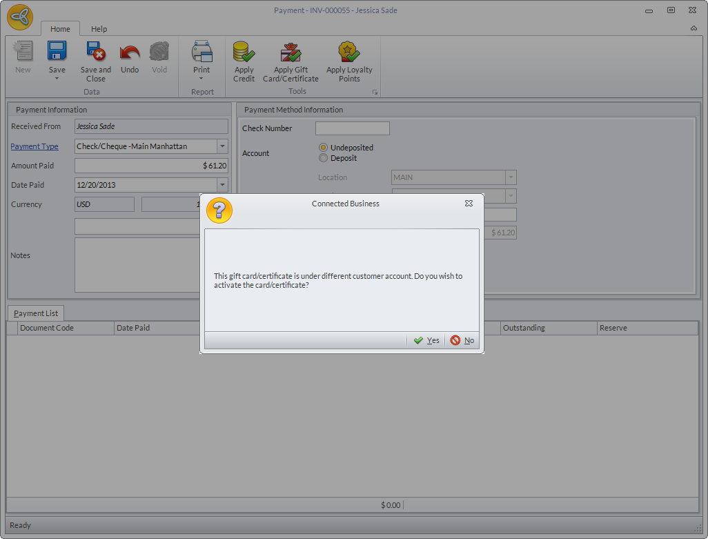 If the gift card/certificate used has been purchased in one customer account but activated in another account, a message prompt will be displayed that the gift card/certificate is under a different customer account. Click Yes if you want to proceed with the gift card/certificate activation, otherwise, click No.