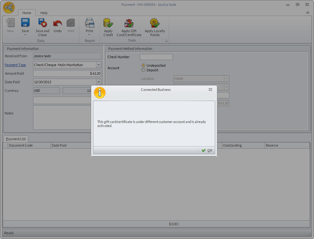 Once activated, the gift card/certificate cannot be used for transactions using another account. In cases where the gift card/certificate associated with one account has been used in another account, the system will not allow you to complete the payment transaction and a message prompt will be displayed indicating that the gift card/certificate is under a different customer account and is already activated. You can use another payment type to process the transaction.