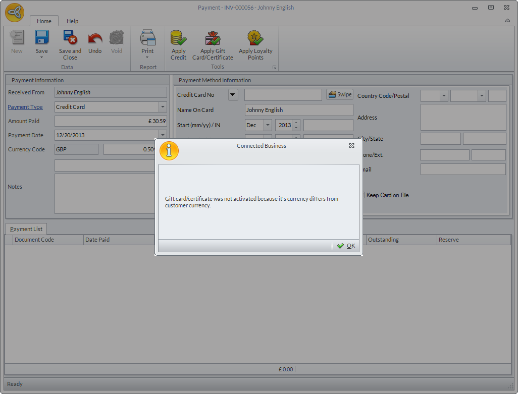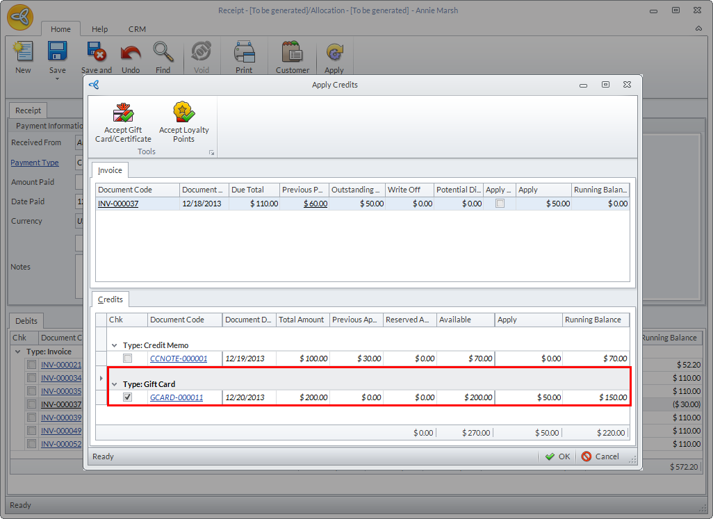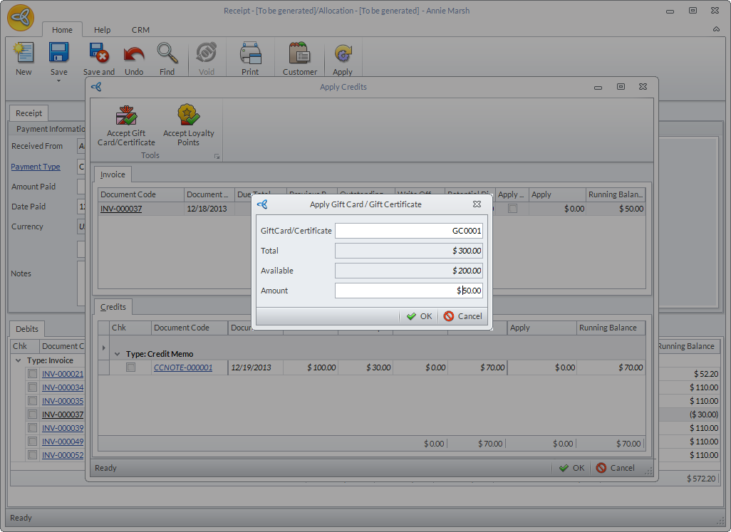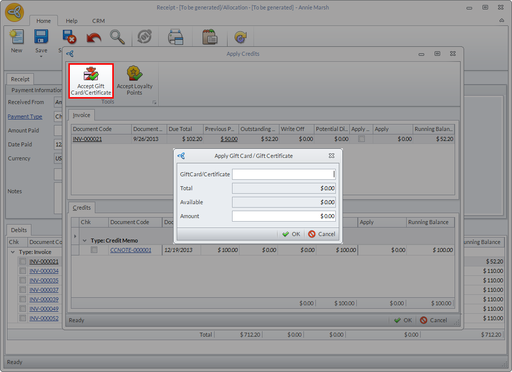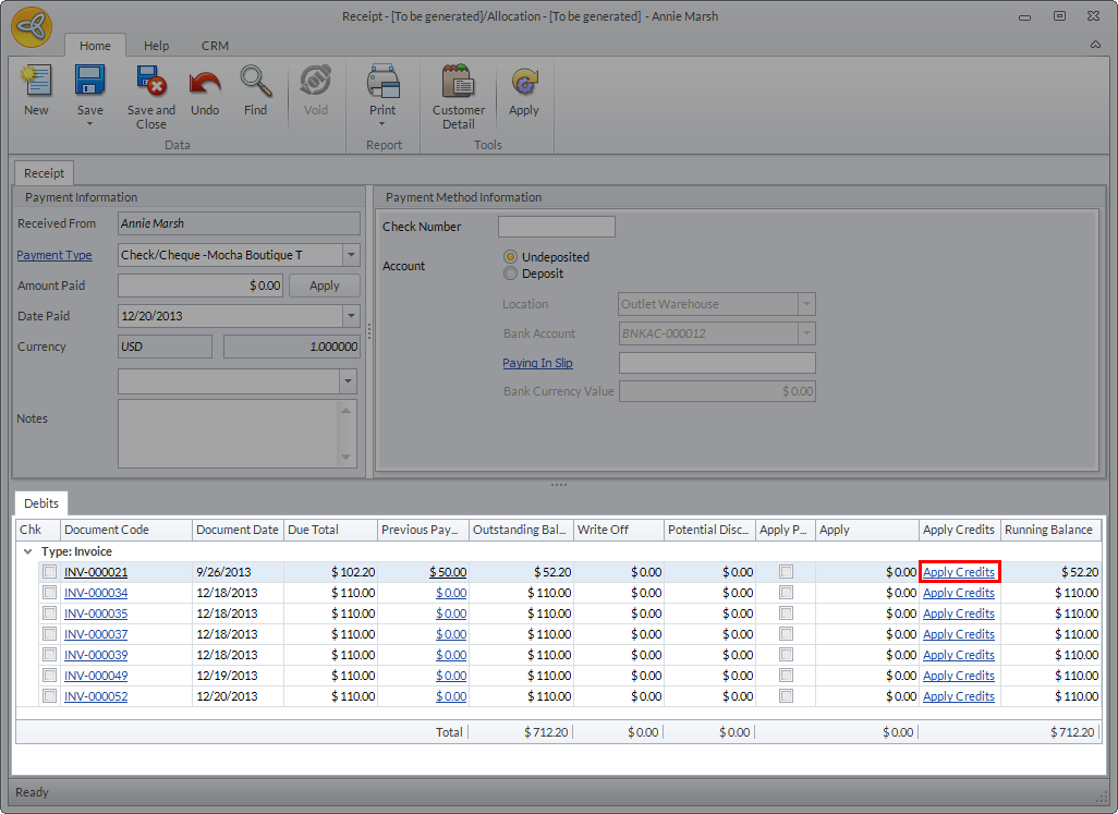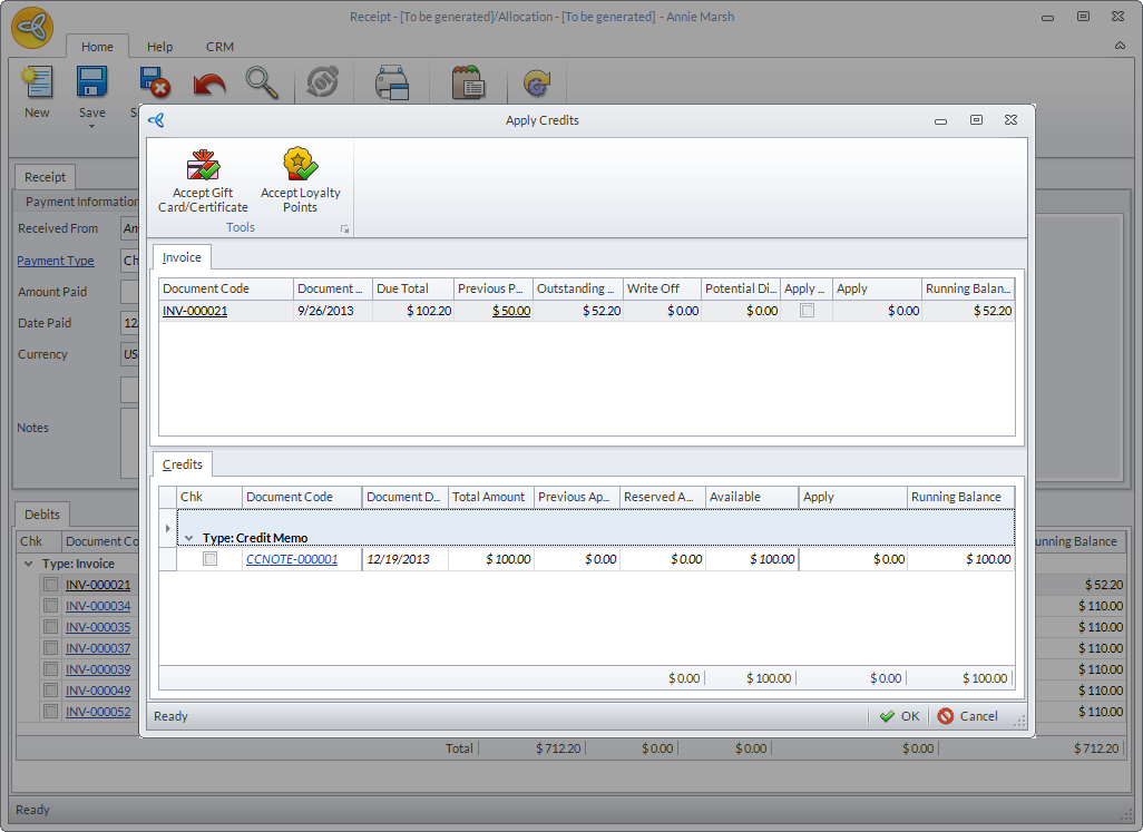 - Click OK to apply the credits then close the Receipt form.