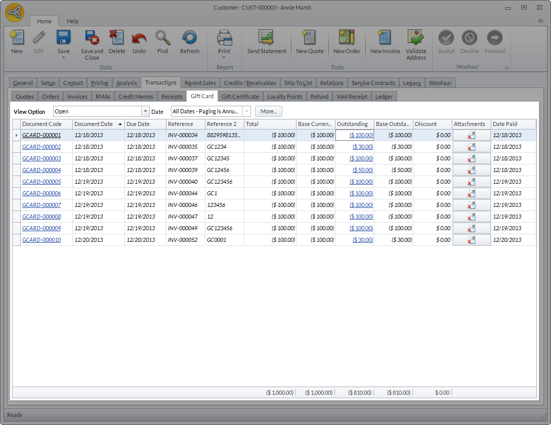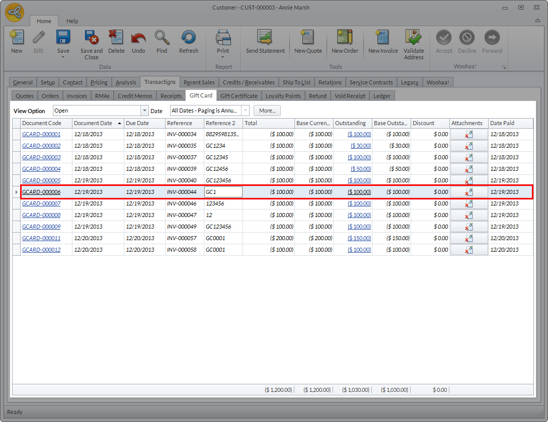 - Go to Transactions tab > Gift Card or Gift Certificate. All gift card/certificate transactions for the customer will be displayed.