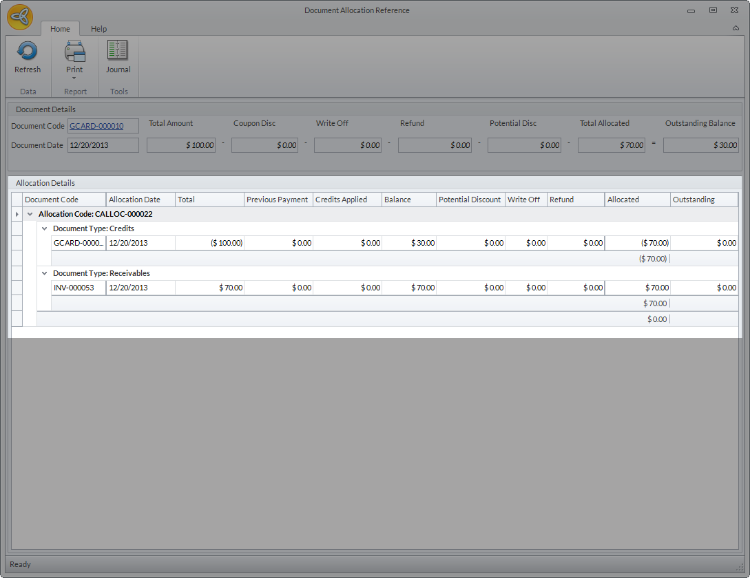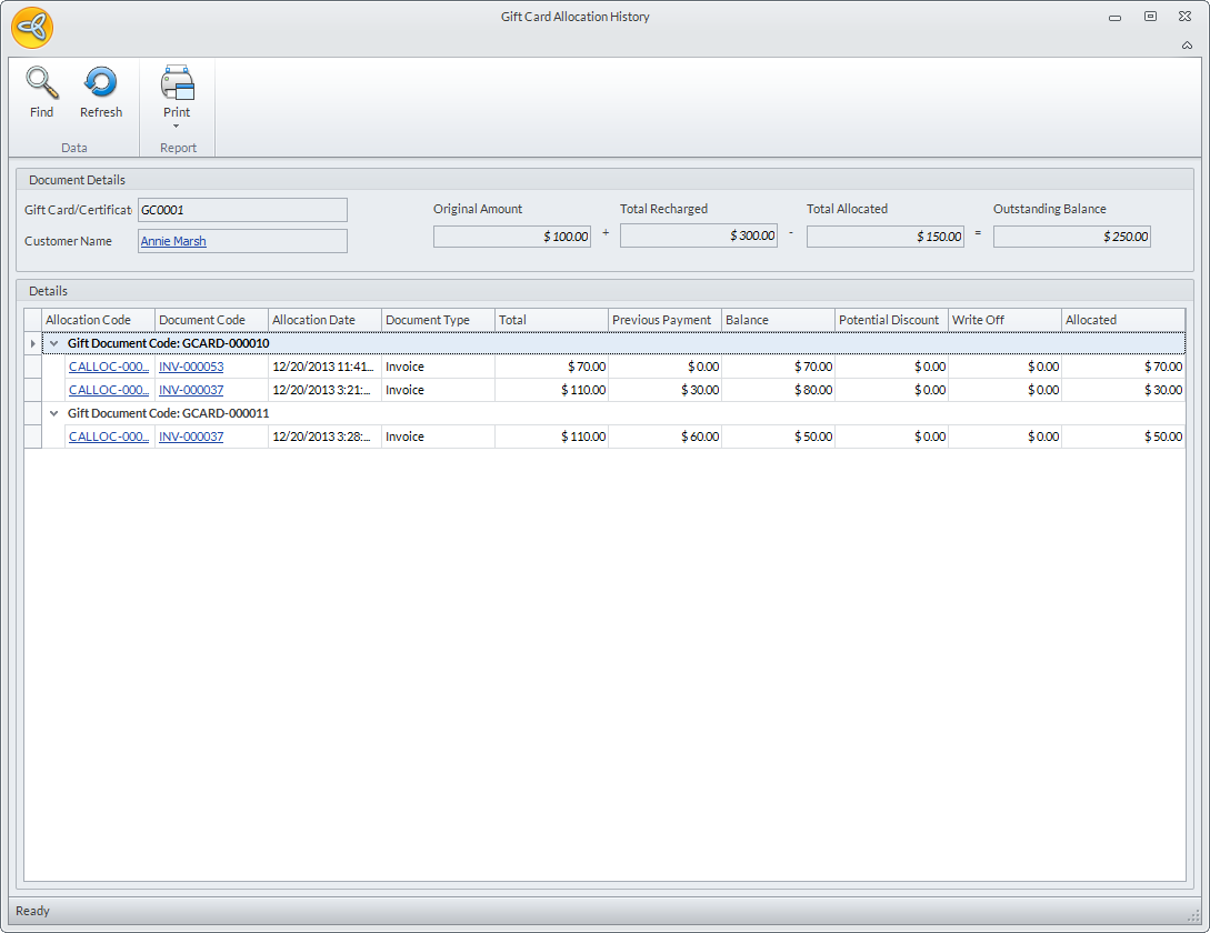 - Click the gift card/certificate balance link in the Outstanding column. The Document Allocation Reference form will be displayed with the gift card/certificate allocation details.