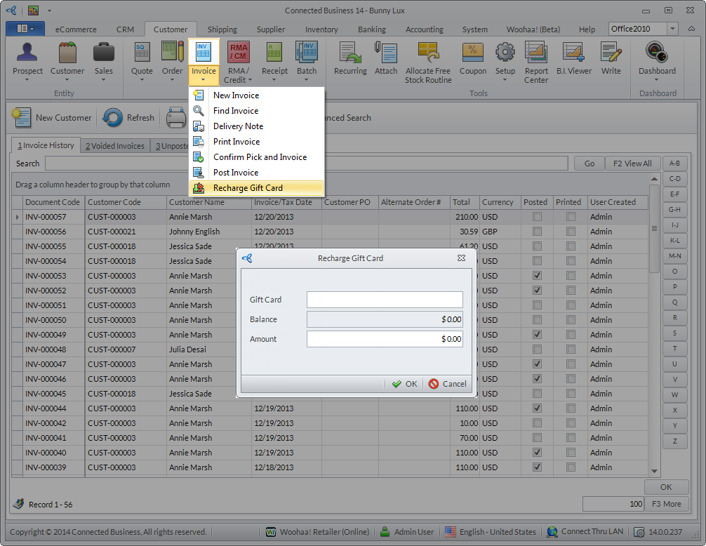 - Go to Customer module > Invoice > Recharge Gift Card. The Recharge Gift Card dialog box will be displayed.