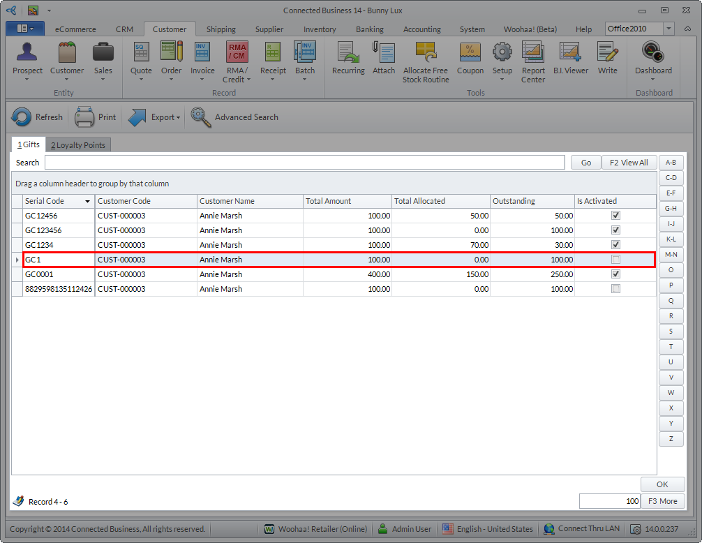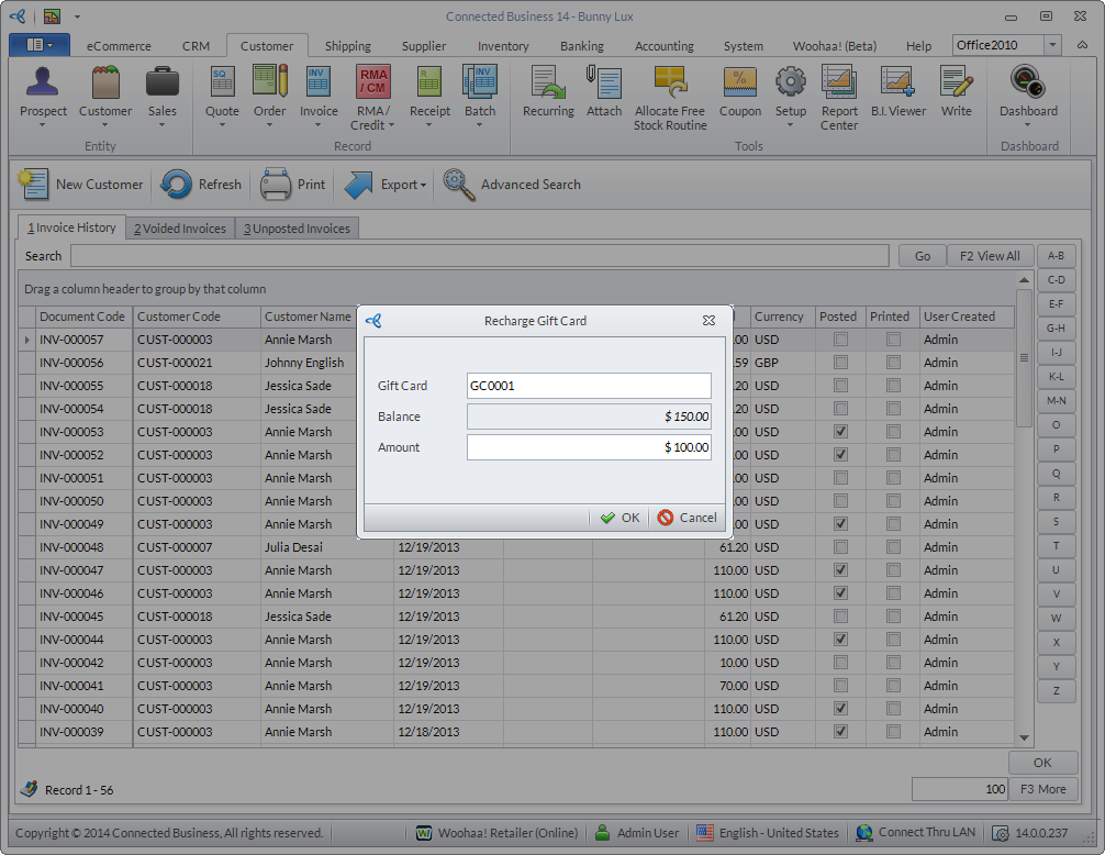 The gift card and gift certificate are the two latest additions of items that can be set up in Connected Business. These can be activated upon initial use and can be used to pay for purchases within the application. You can also manually or automatically generate the gift card/certificate serial numbers and send it thru email.