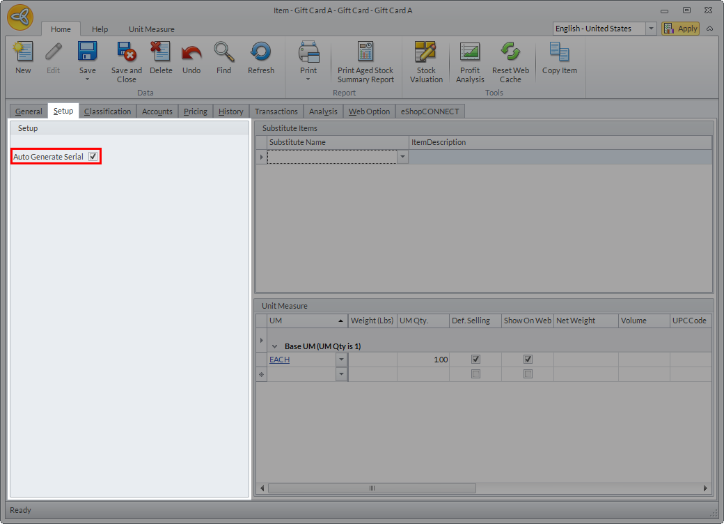 Gift card/certificate serial numbers can be manually or automatically generated. This can be set either from the New Item Wizard (upon creating the item) or from the Item Detail form. Note: For more information on creating gift card/certificate, refer to Create Gift Card or Create Gift Certificate.