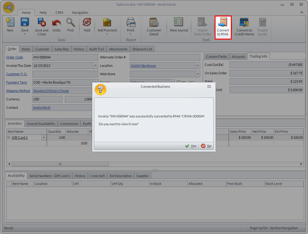 - In the Sales Invoice form, click Convert to RMA. A message prompt will be displayed confirming if you want to convert the invoice to RMA. Click Yes to proceed. Another message prompt will be displayed indicating that the invoice has been converted to RMA. Click Yes to view the RMA form.