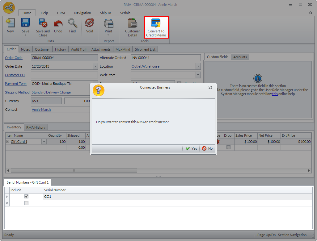 - Click Convert To Credit Memo. A message prompt will be displayed confirming if you want to convert the RMA to credit memo. Click Yes to proceed. The Credit Memo form will be displayed.