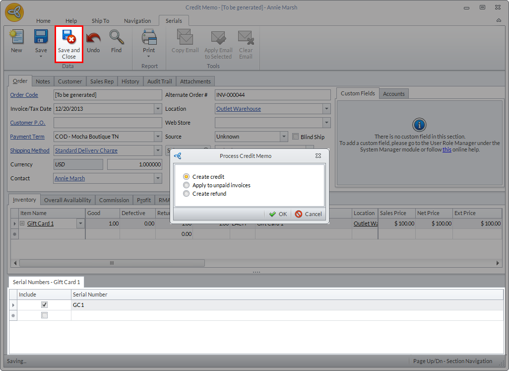 - In the Serial Number section of the Credit Memo form, tick the serial number of the gift card/certificate to be returned.