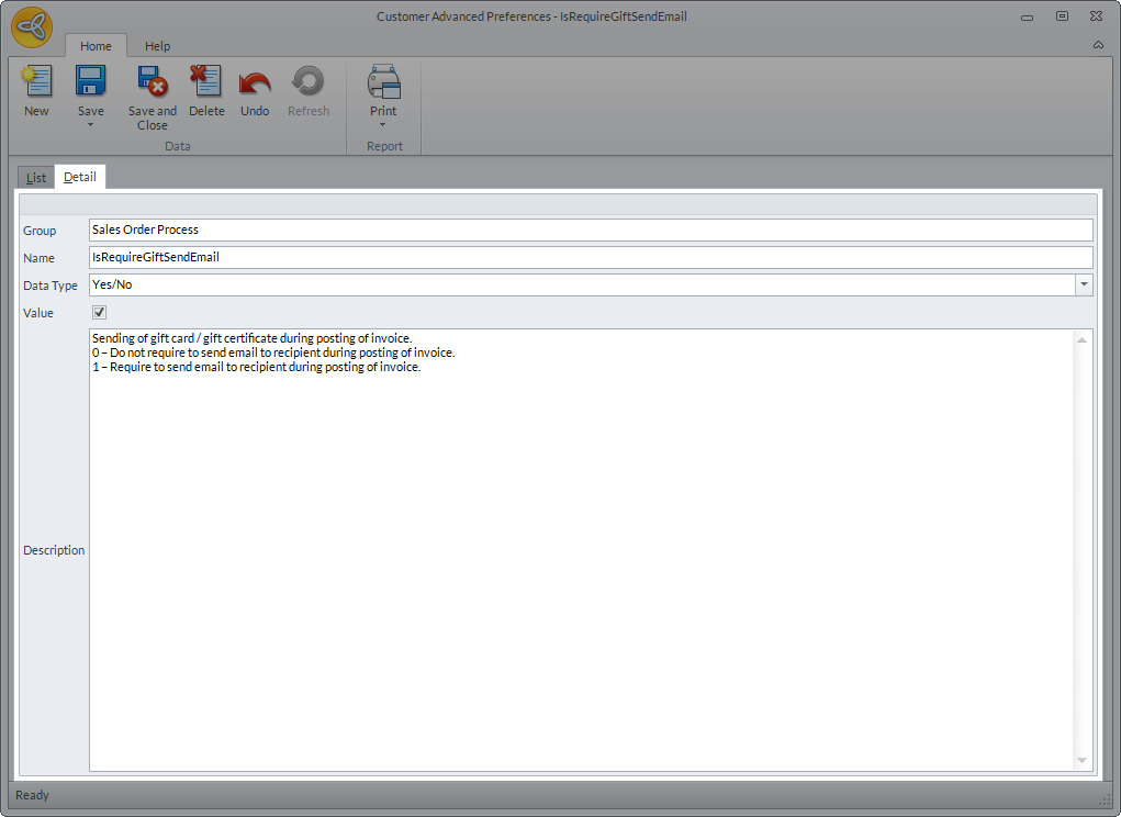 - Search for the IsRequireGiftSendEmail preference. The preference details will be displayed.