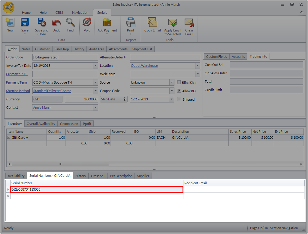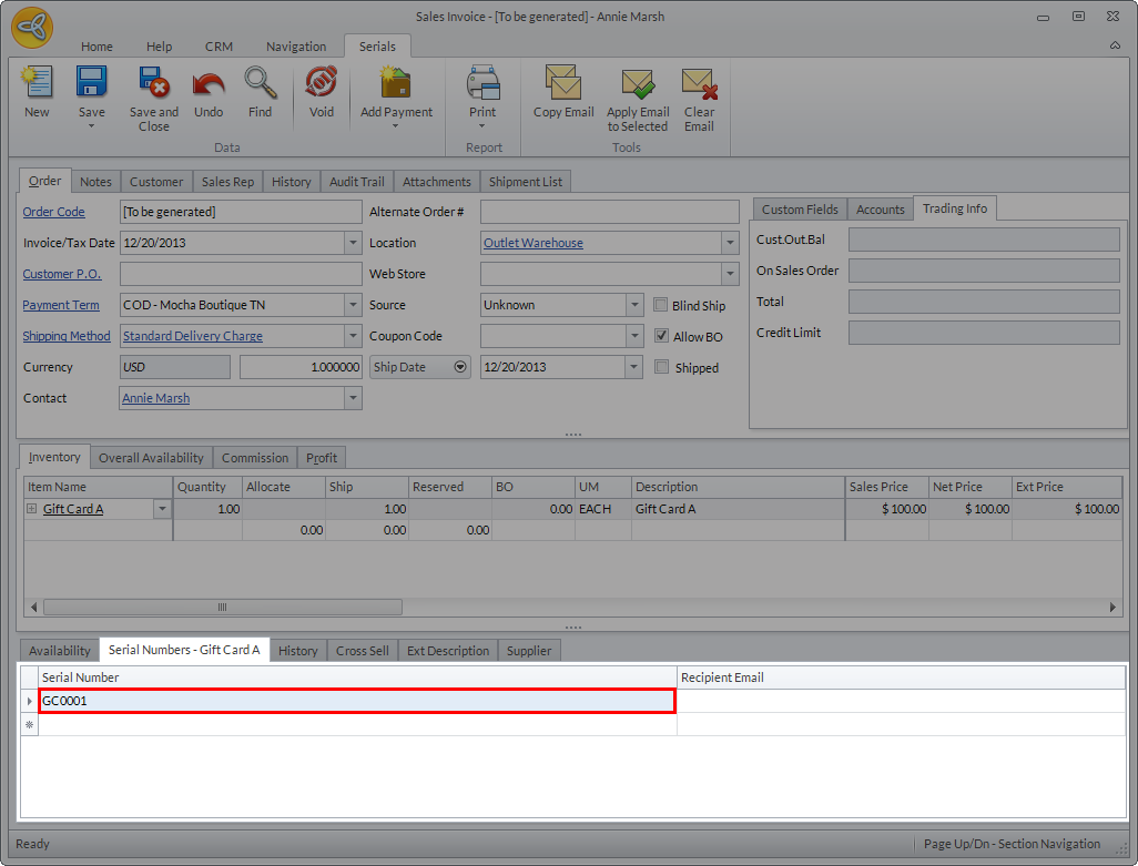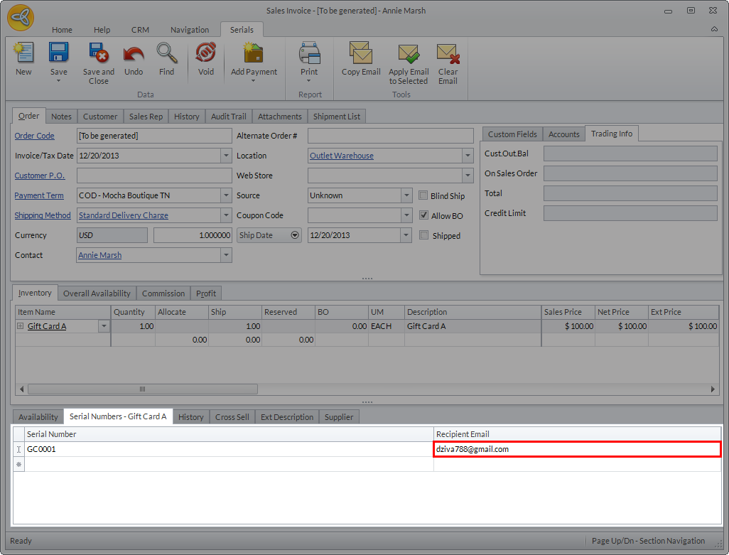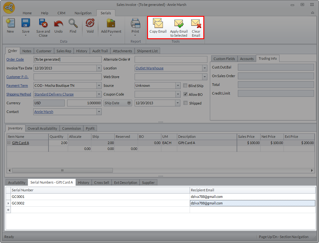 To send the gift card/certificate via email, simply indicate the recipients email address in the recipient email column of the Serial Numbers tab in the sales invoice. If there’s an email address associated with the customer or customer contact, it will be automatically entered by the system.
