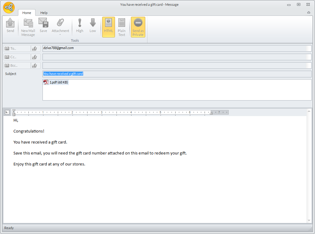Gift cards/certificates can be sent thru email. It can be sent to the customer’s email account or to another email if preferred. Included in the email are the gift card/certificate serial number, amount, and available balance.
