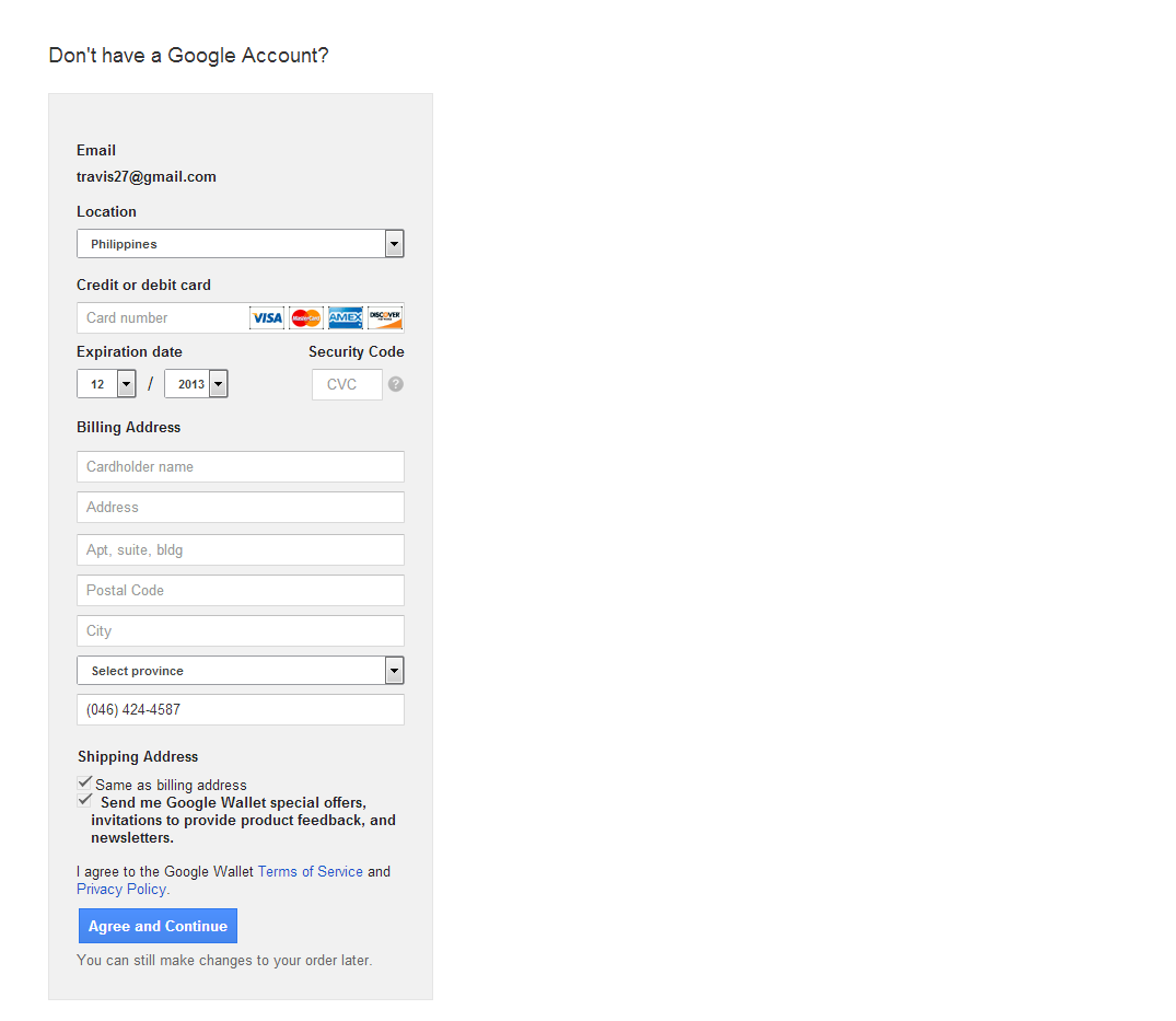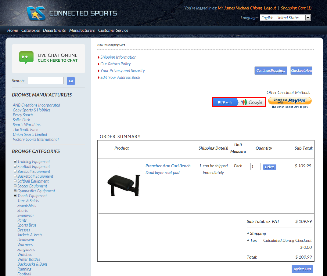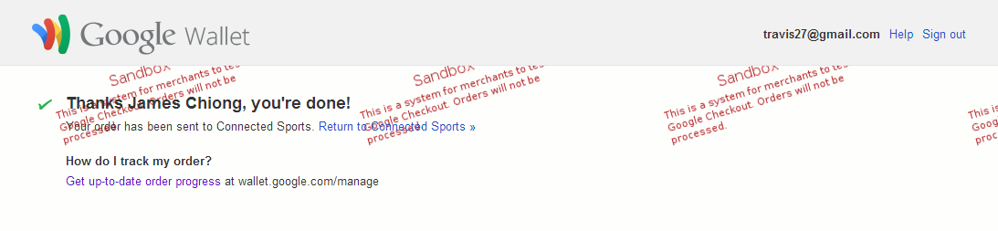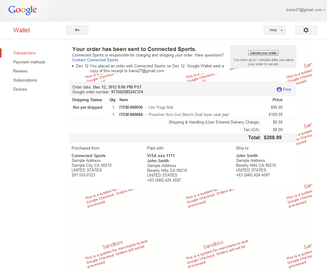 - On the webstore, check out an item by using Google Checkout. You will be redirected to Google's Checkout form.