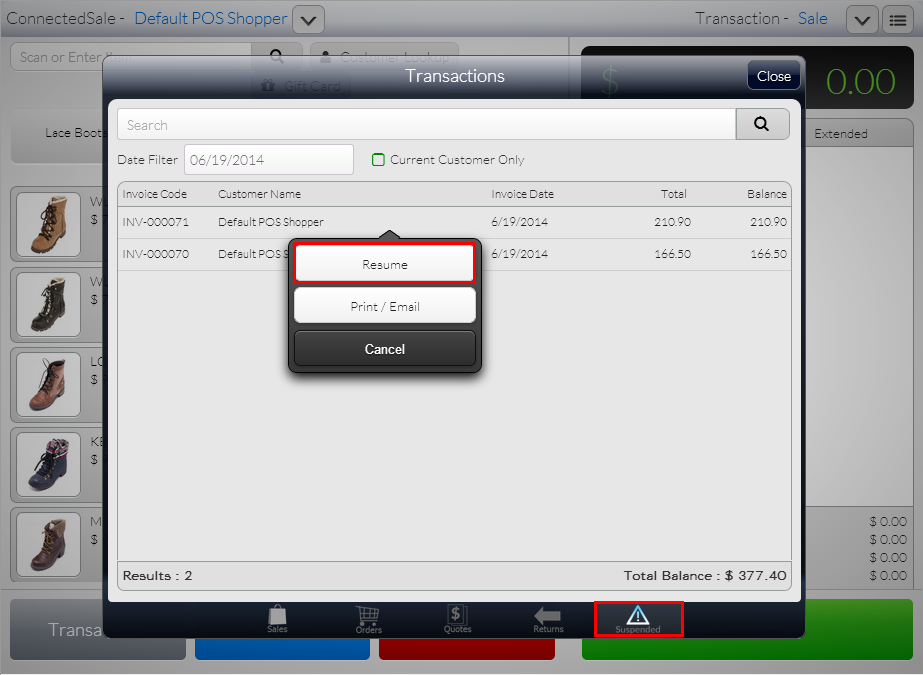 - Select Resume option. The sale transaction details will be displayed in the Transaction tape.