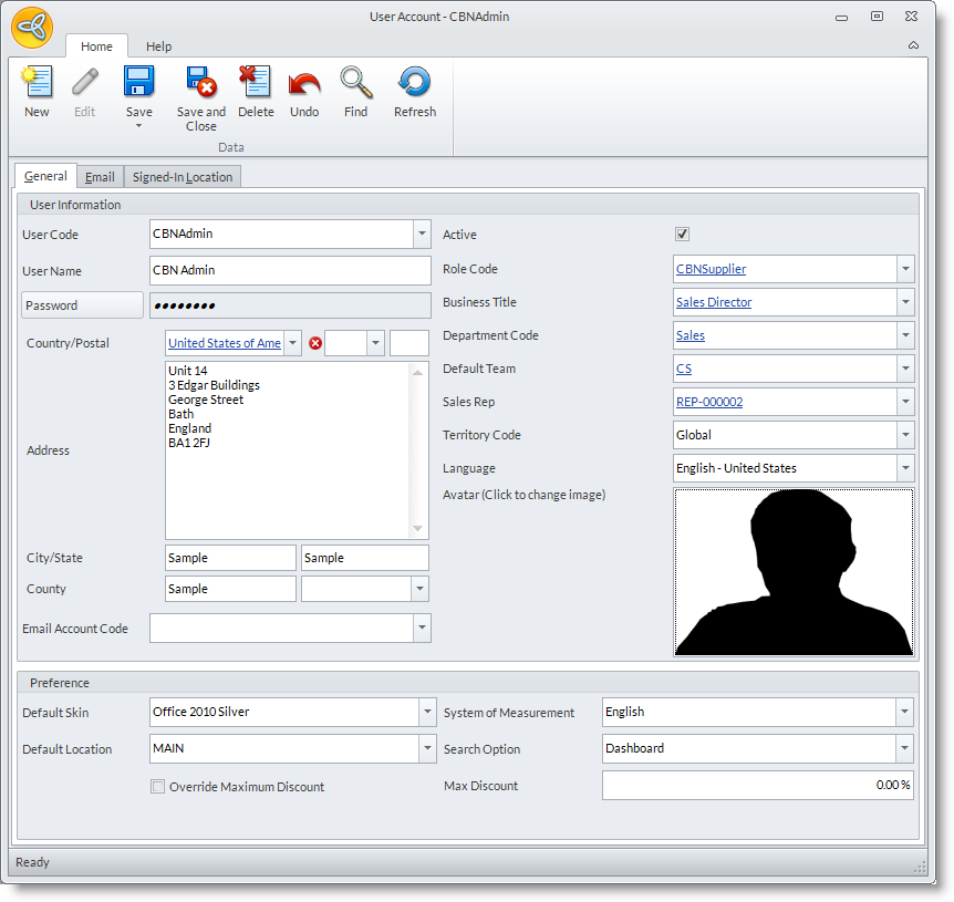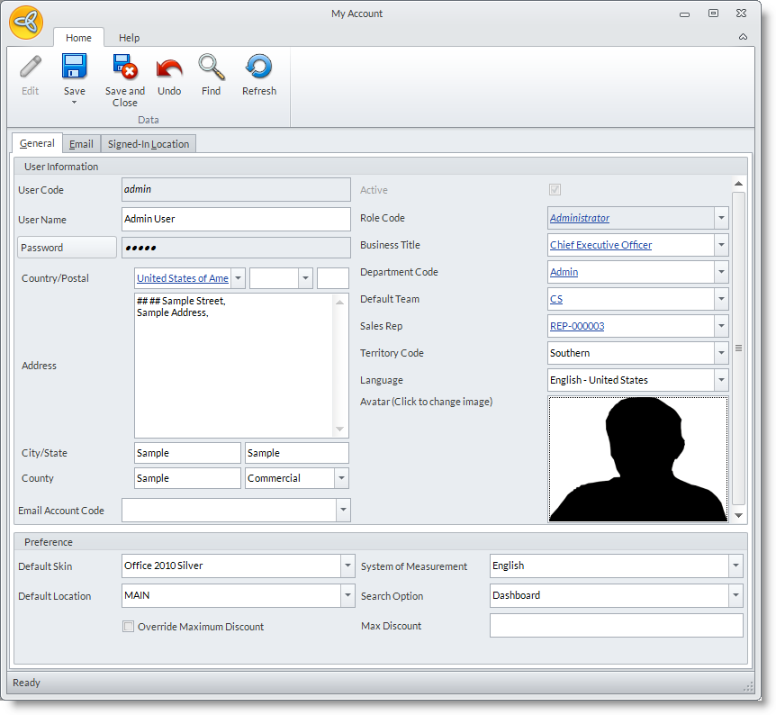 - The User Account form for your account will be displayed. Modify the necessary information from the General Tab; view the details you need from the Email and Signed-in Location tabs.
