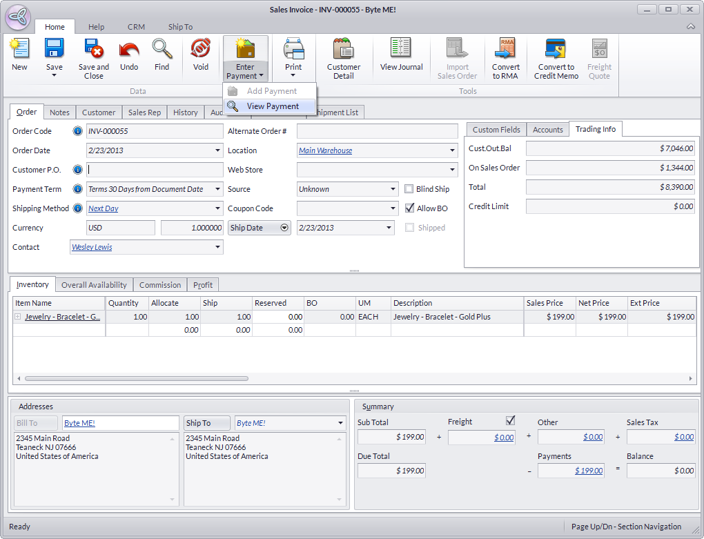 - On the Sales Invoice form, click Enter Payment > View Payment.