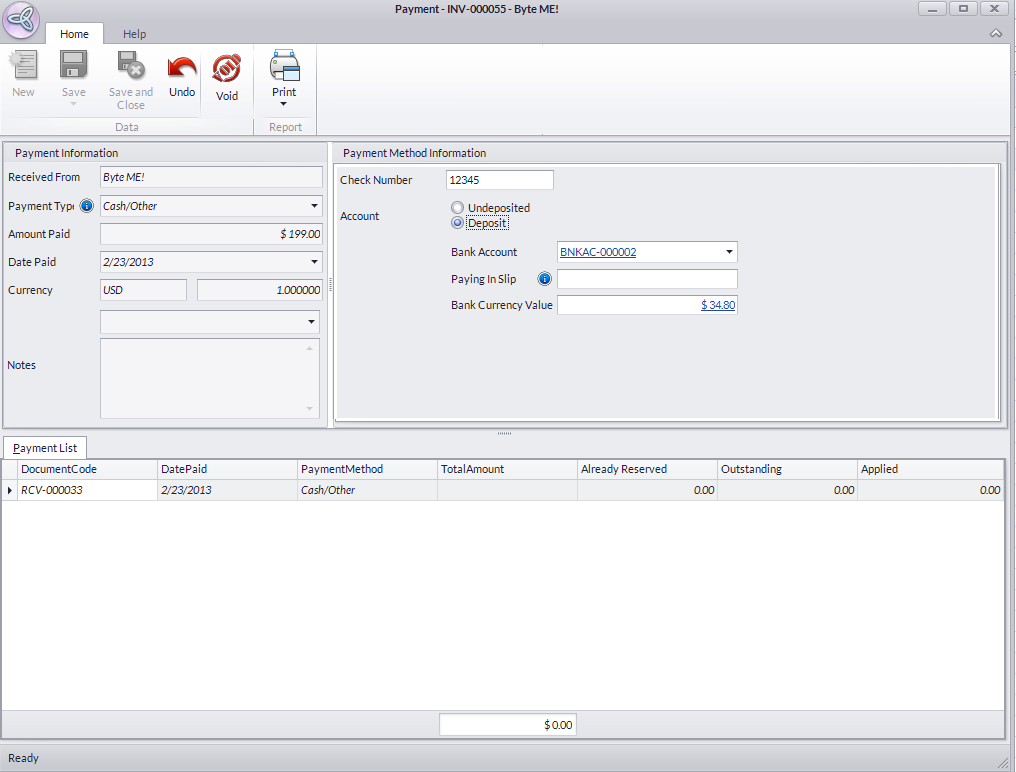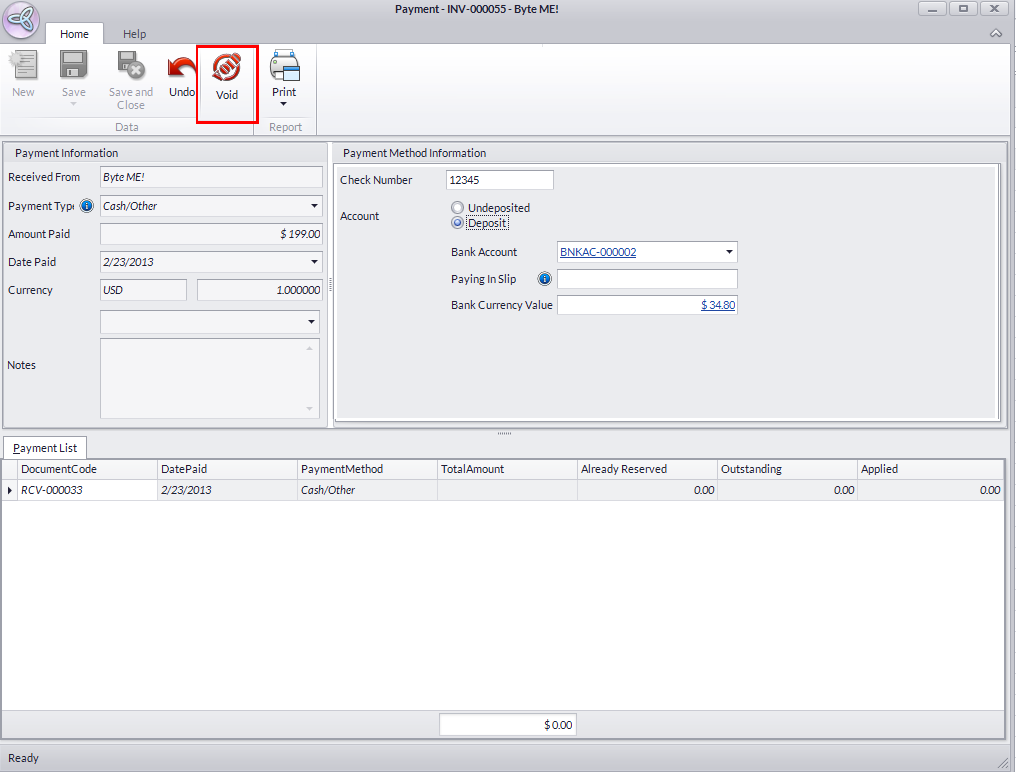 - From the Payment Form, you can Void the payment made, or Save and Close to apply modifications (if you have made any) in the form.