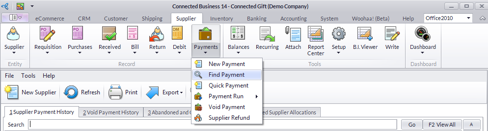 - From the Supplier module, select Payment > Find Payment. The supplier payment search screen will display.