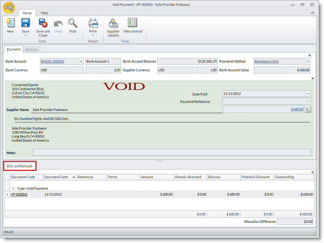 - Open the supplier payment. In the Bills and Refunds tab of the Supplier Payment form, you will see the voided supplier payment.