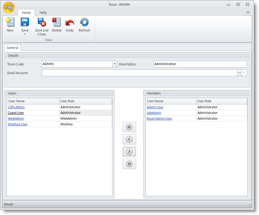 - You can modify specific user account information from the User Team form by double-clicking on the user account you want to modify. Include and remove user accounts from the selected team by using the chevron icons, moving user accounts from the Users column to the Members column.