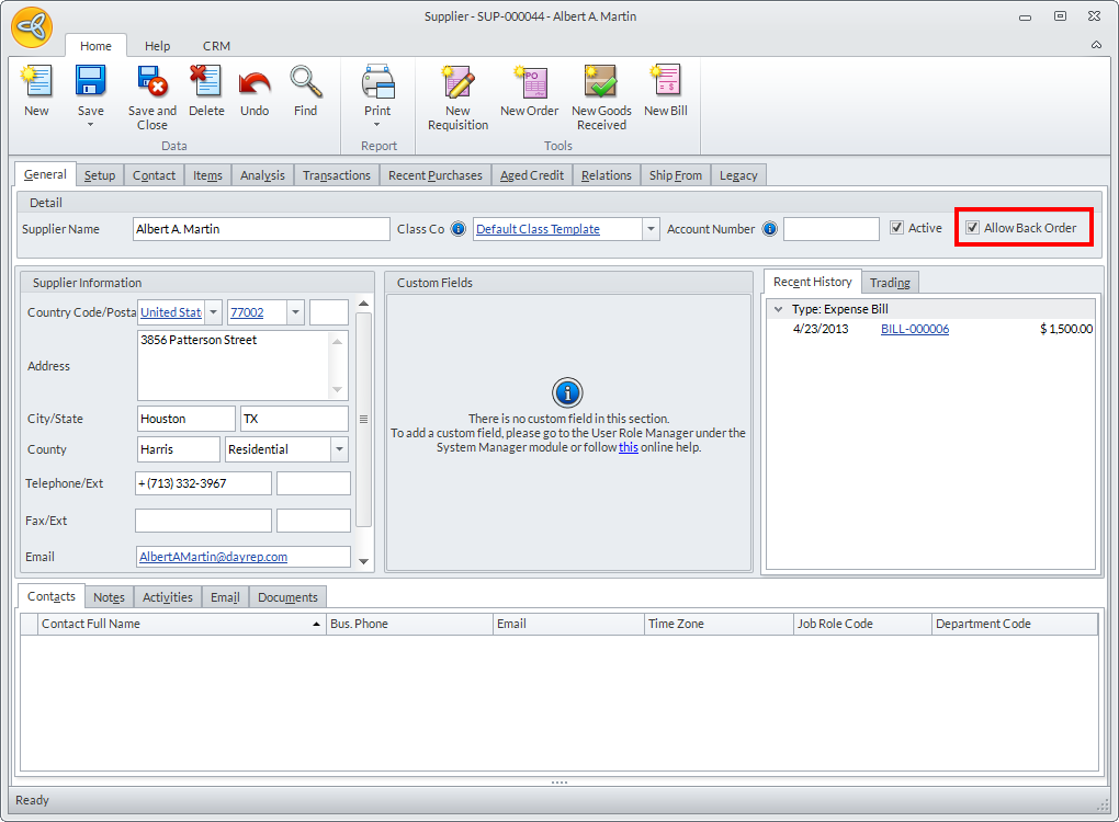 - On the Supplier form, tick the Allow Back Order checkbox.