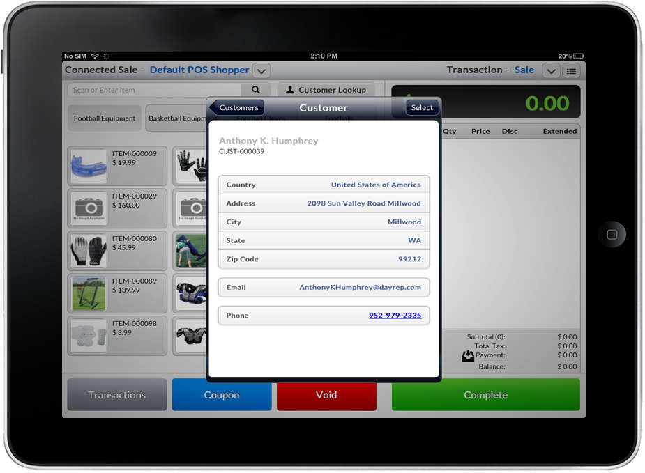 - The user can also tap on the arrow next to the customer on the list and the details of that customer will be displayed. Tap button on the upper right corner labeled “Select” will set that customer as the customer for the current transaction.