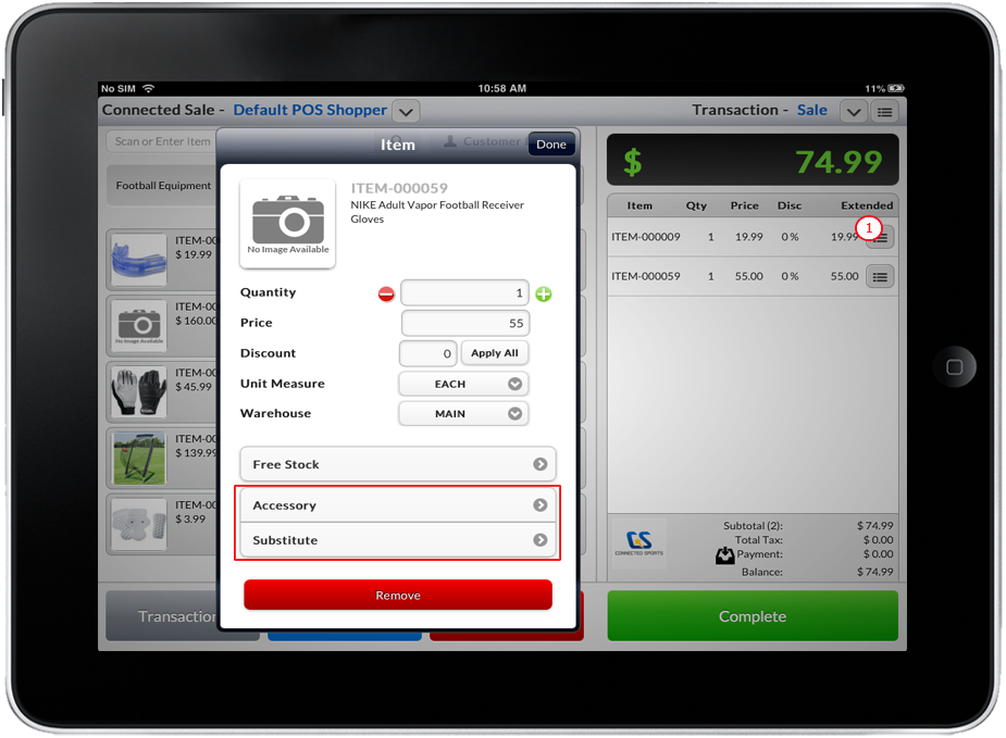 - After adding an item, Tap on an item. Then tap the Accessory or Substitute button. Make sure that an item has accessories or substitute associated to it.