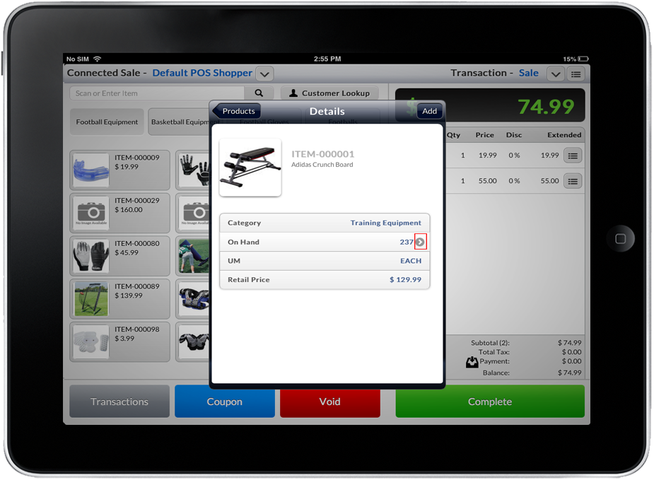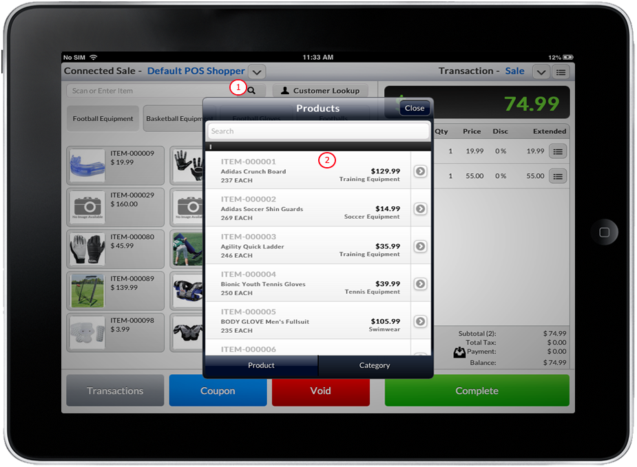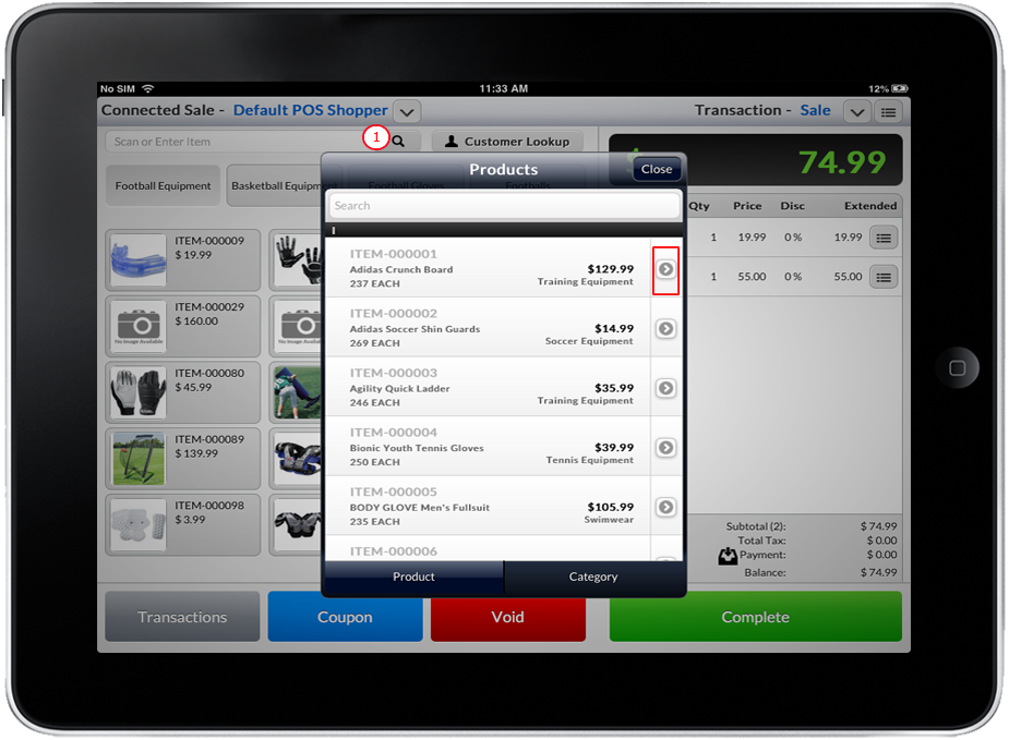 Tap on the Product Lookup button to display a list of available items. Select and tap the item from the product list or tap the arrow button next to the item.