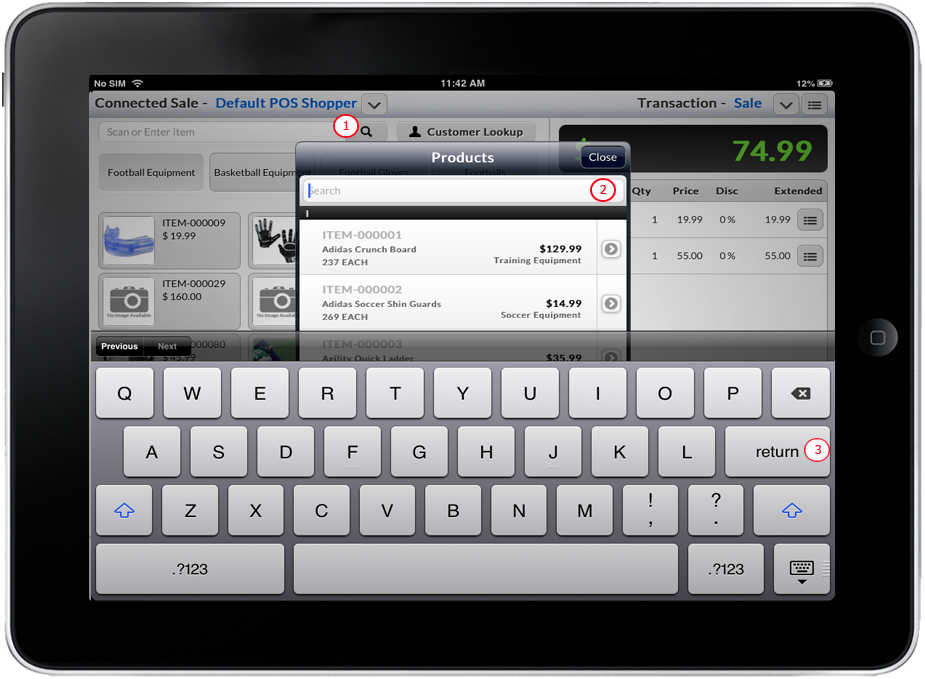 Tap the Product Lookup button to display a list of available items. Input the partial/complete item code on the search text box field and Tap Return button on the keyboard display.