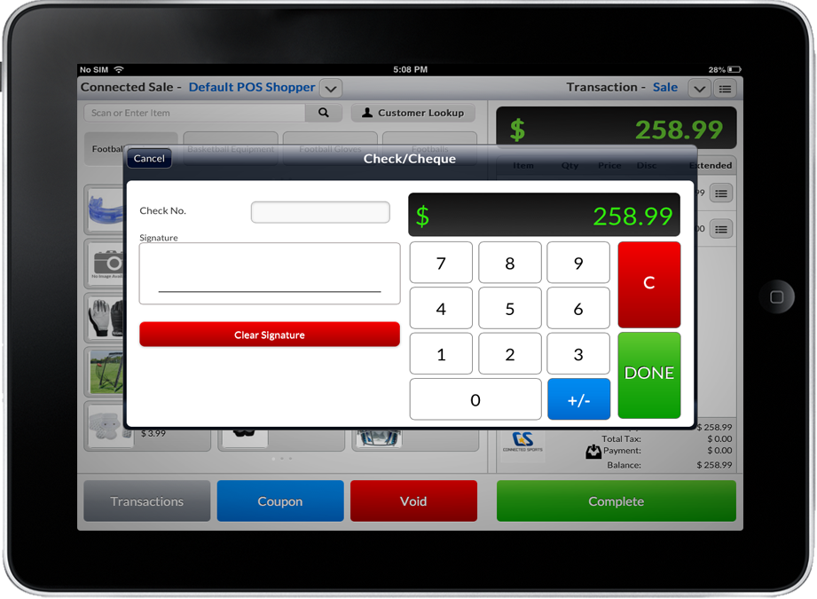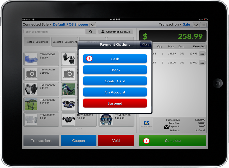 - Tap on Complete button and then tap the Cash button from the payment options window.