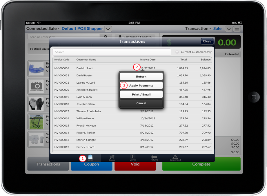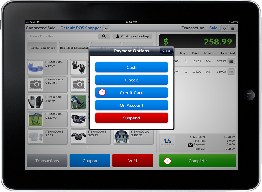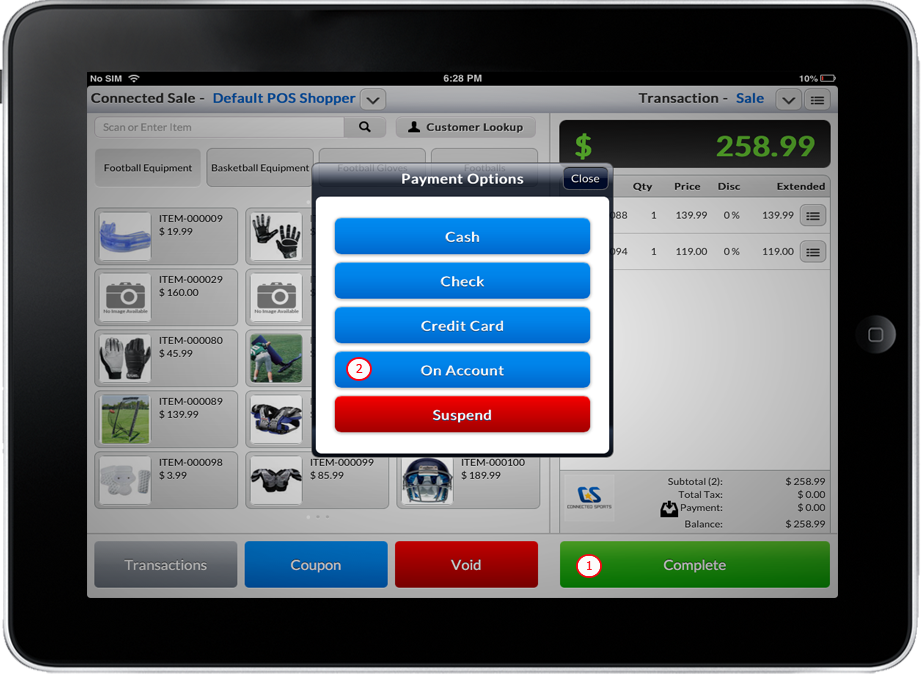 - Tap on Complete button and then tap the On Account button from the payment options window.