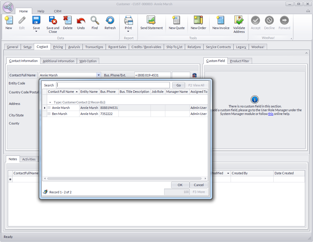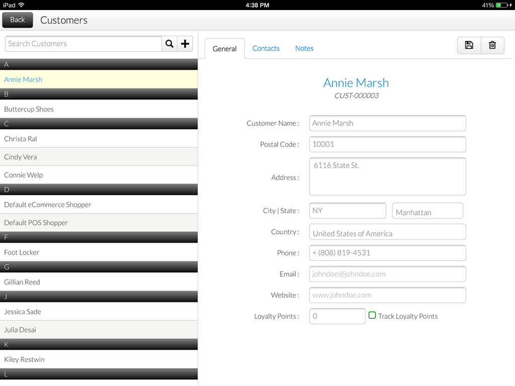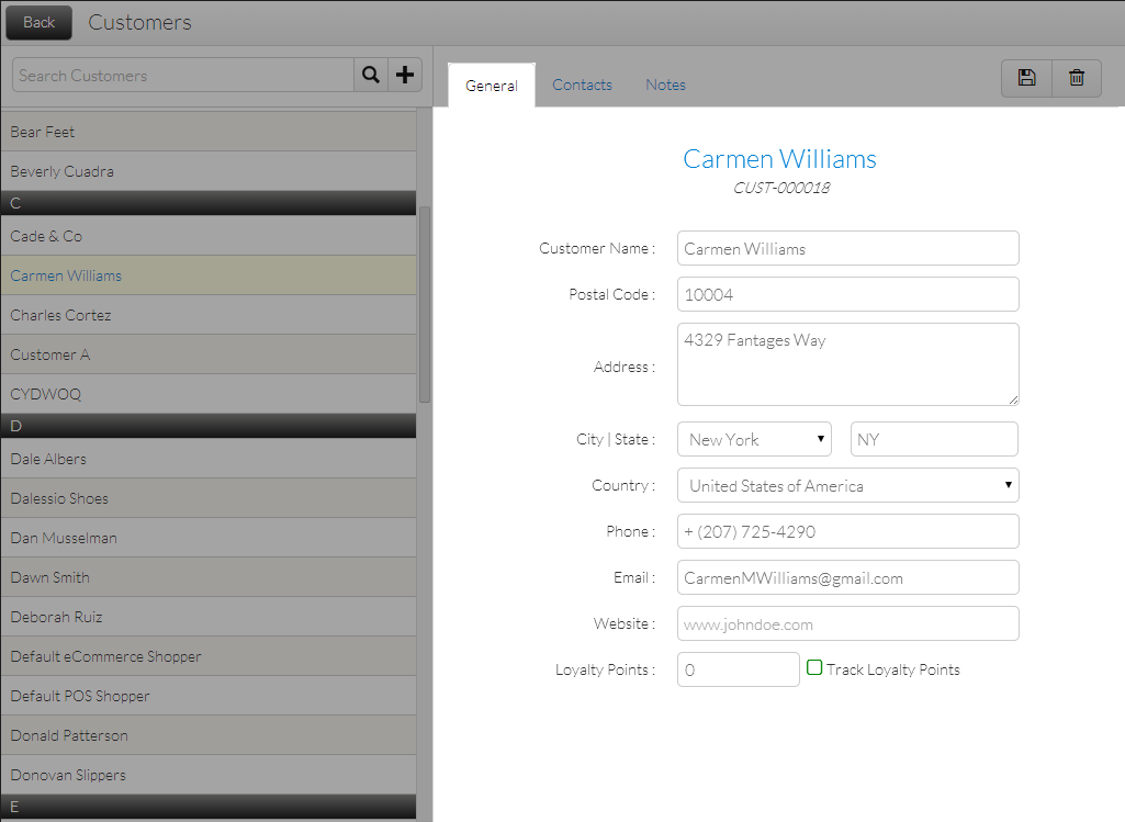 - Select a customer from the list. The customer’s information will be displayed from the General tab.