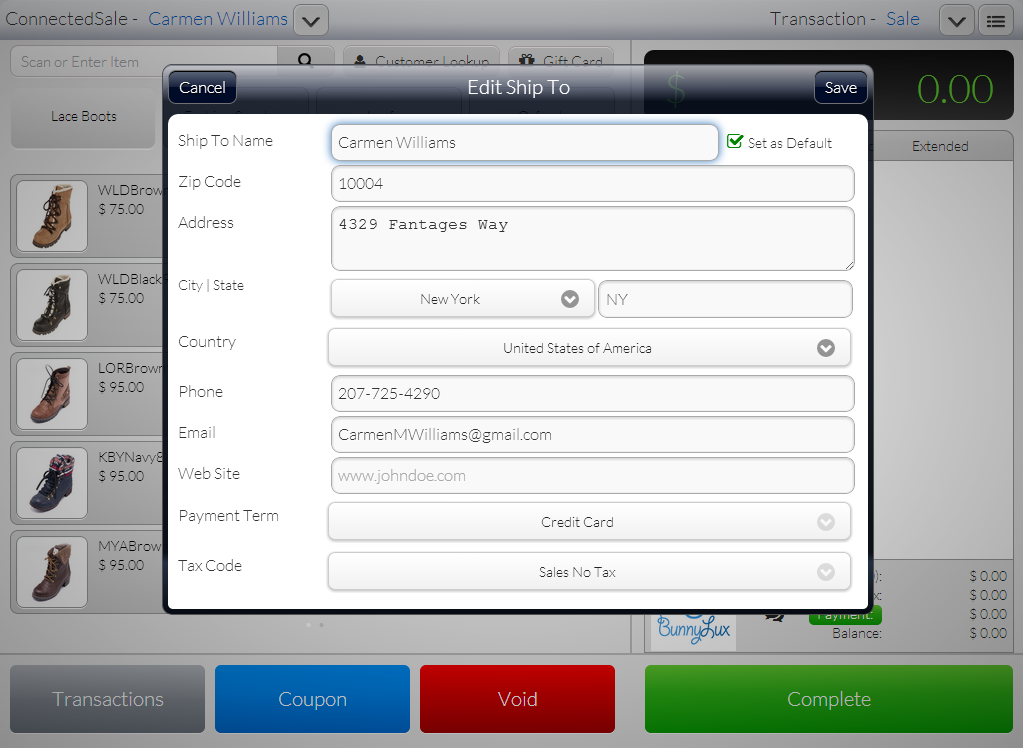 Adding new and editing existing customer contacts can be done in Connected Business POS Mobile. Now, editing Customer and Ship To information can be done as well. This allows store owners and users to directly update the customer’s personal and contact information (contact person, address, business phone number, and email address), as well specify where purchased goods are to be sent from the POS device.