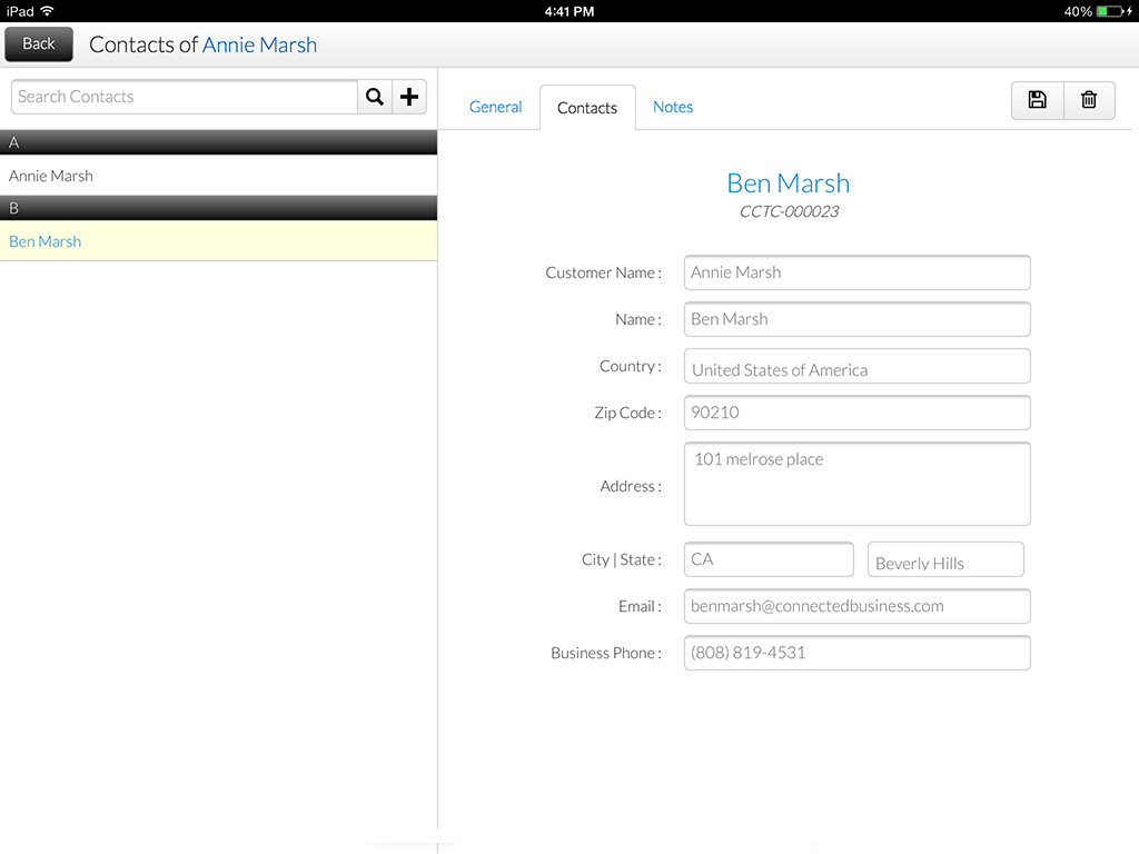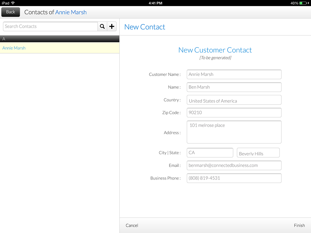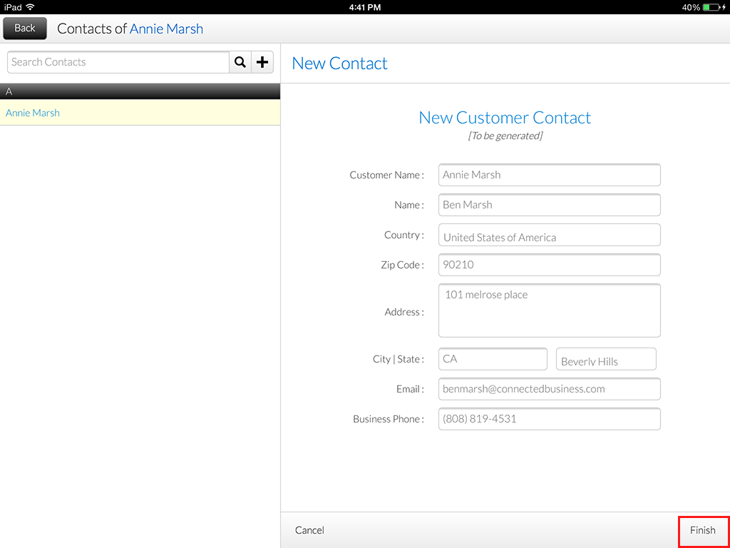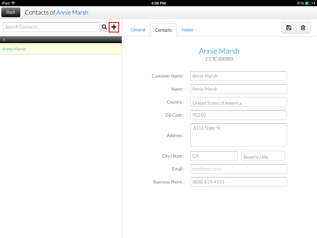 - Tap the Contacts tab to display the customer’s contact details. From here, you can directly edit the contact details as needed.