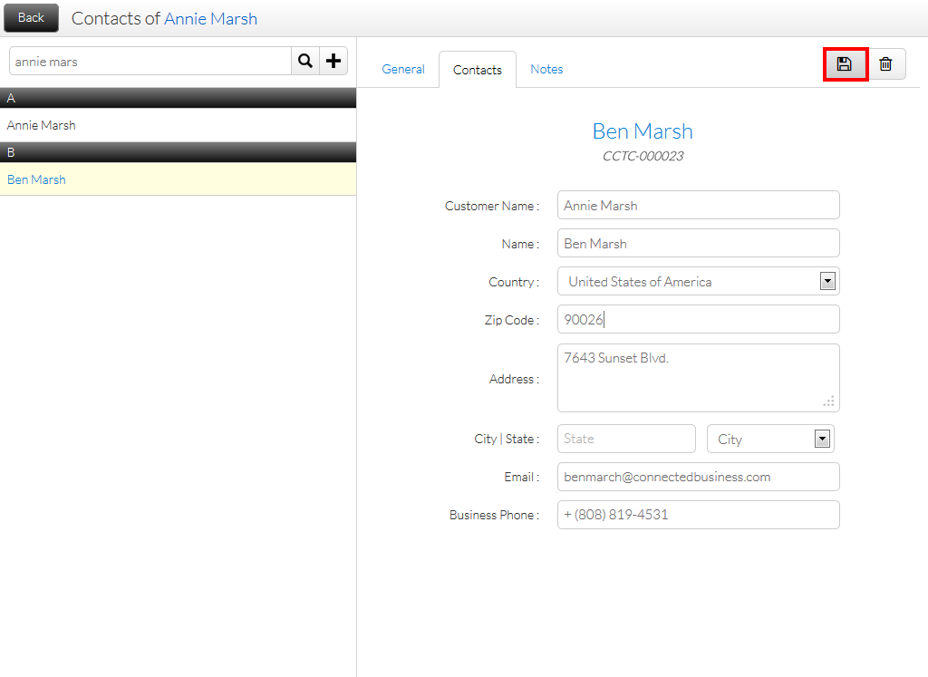 You can check the updated customer contact from the Customer Details form > Contact tab in the Connected Business backend.