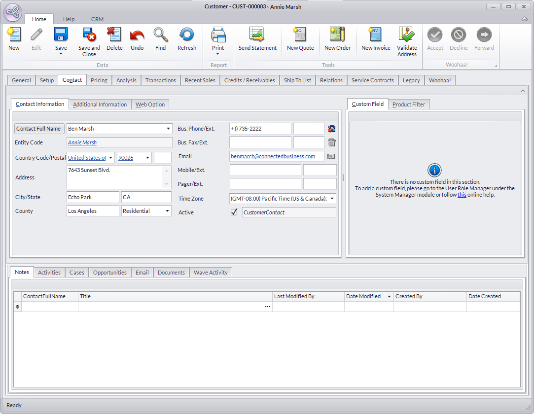 To check the newly-created customer contact from the backend, go to the Contacts tab of the customer detail form. From here, you can change the default contact details for the customer.