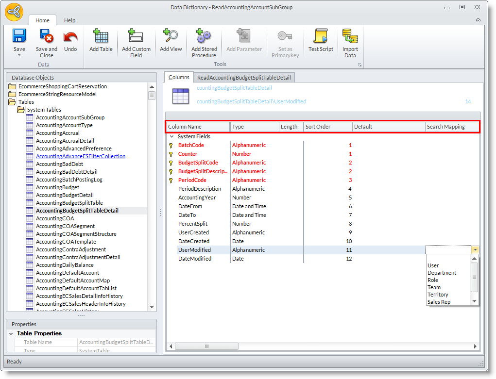 | Search Mapping | Select the value to which the column should be mapped. This is useful in finding specific searches in the forms. See: Using the Seach Manager |