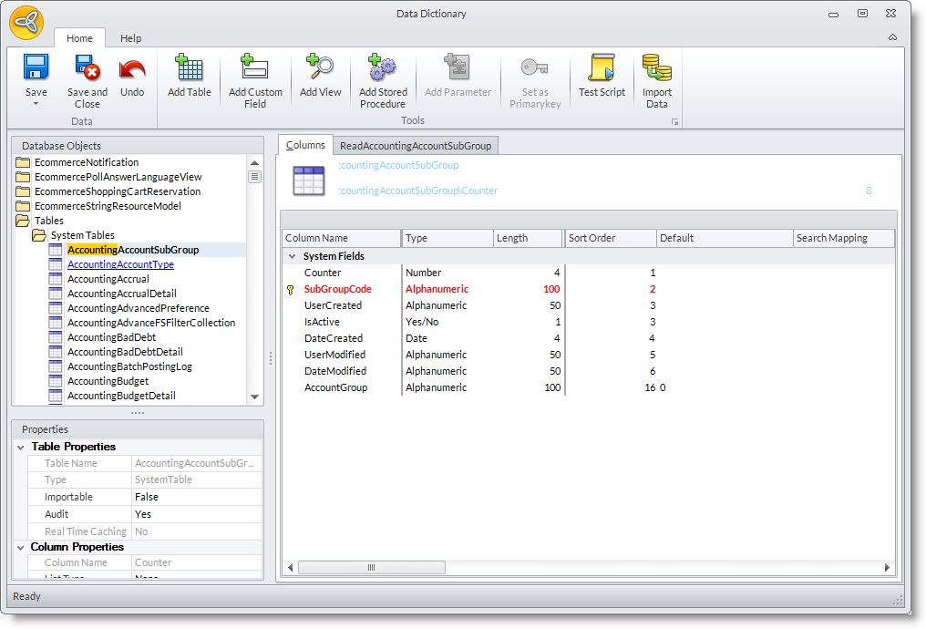 - The Database Objects List on the left lists all tables, views and stored procedures (from your existing system views and tables as well as custom views and tables created in the data dictionary).