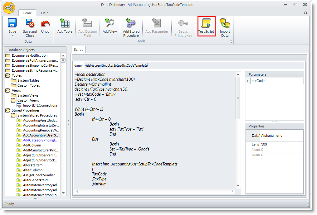 - Click on the Test Script button to exceute the command in the Connected Business database.