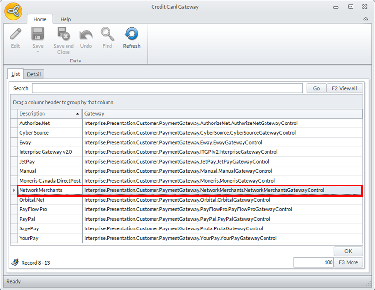 - Go to Banking > Setup and select the Credit Card Gateway option. The list of supported credit card gateways will be displayed.