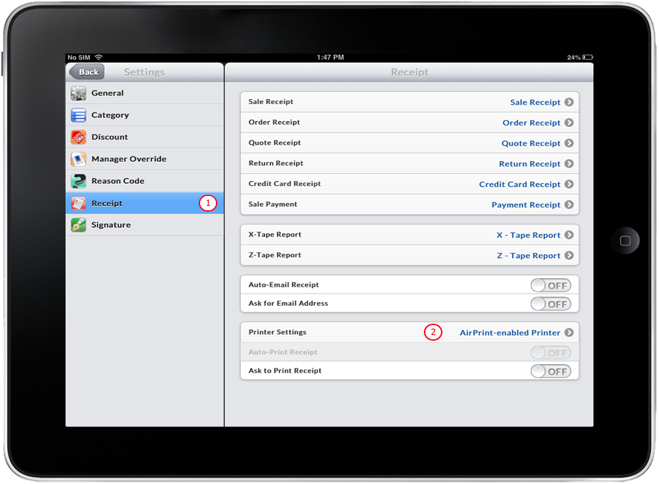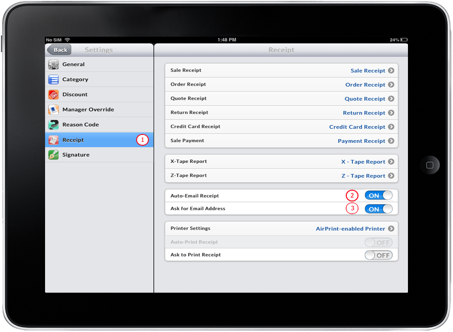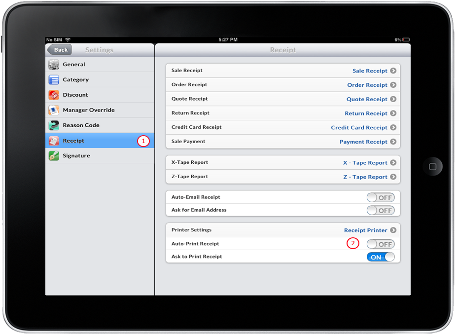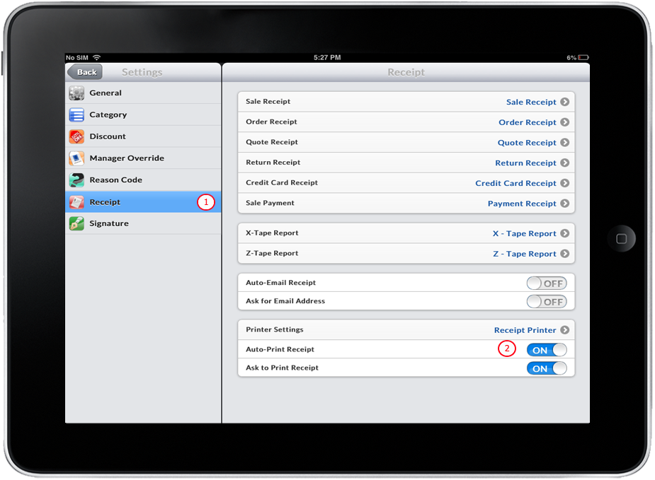 - Make sure that Printer Settings is set to Receipt Printer and Ask to Print Receipt is turned ON.