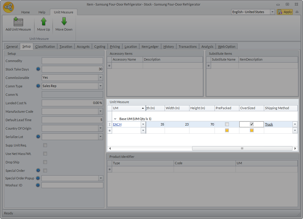 - Click on the Setup tab of the Item form. On the Unit Measure section, set the dimension such as height, width and length of the item and tick the OverSized column checkbox.