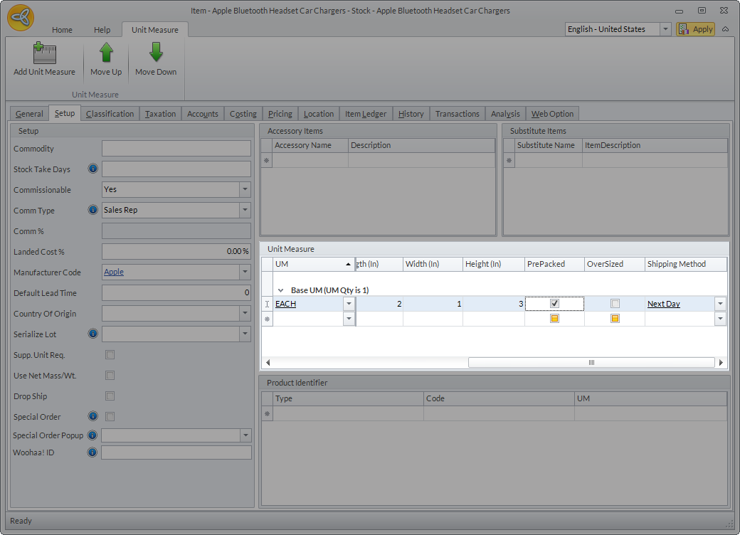 - Click on the Setup tab of the Item form. On the Unit Measure section, set the dimension such as height, width and length of the item and tick the PrePacked column checkbox.