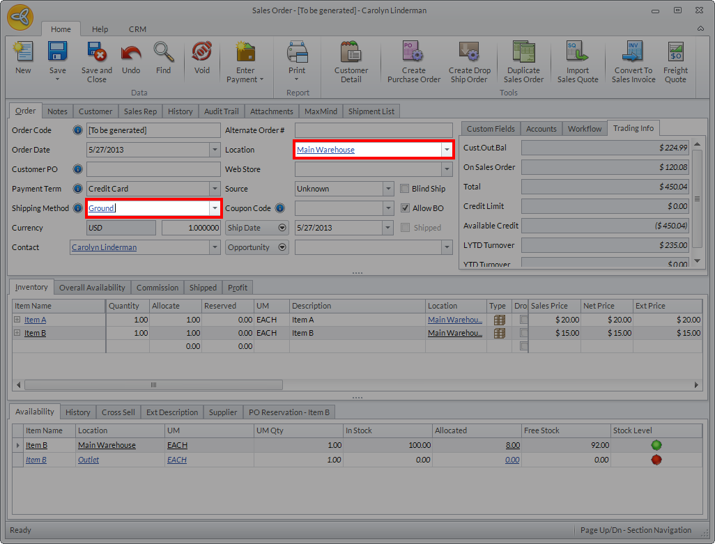 - Go to Customer module > Order > New Order and select a customer from the Bill To or Ship To list to open the New Sales Order form.
