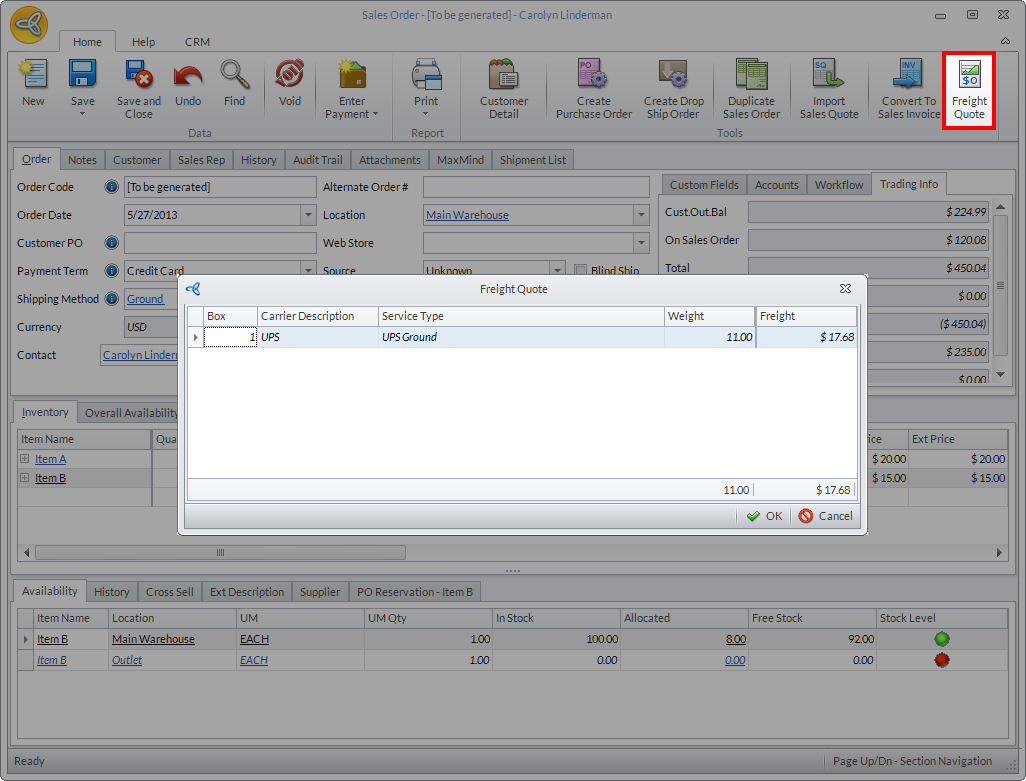 The Freight Quote option is a tool that allows you to get realtime freight charges from your selected shipping carrier directly within the Sales Order and Sales Invoice form.